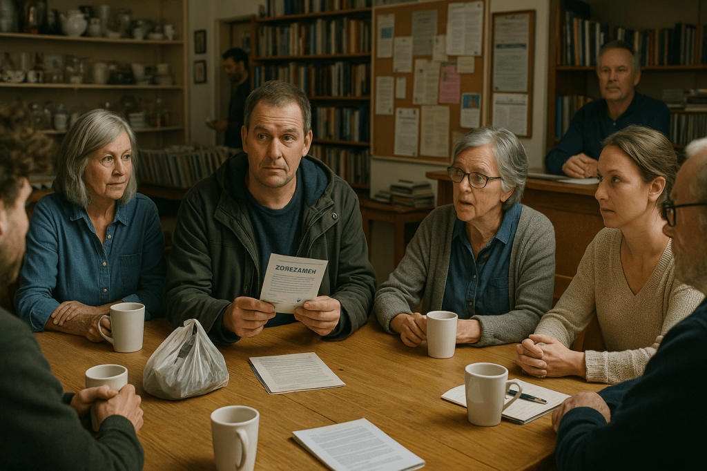 De tafel vult zich. Geen reddingsplannen, maar haalbare handreikingen. Iemand pakt pen en papier. Een ander maakt een foto van het prikbord.