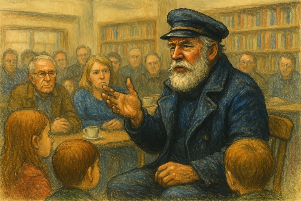 De man met de schipperspet stond op, rekte zich uit, en keek nog één keer naar de leestafel vol gezichten — jong en oud, hongerig naar verhalen die je nergens anders hoorde.