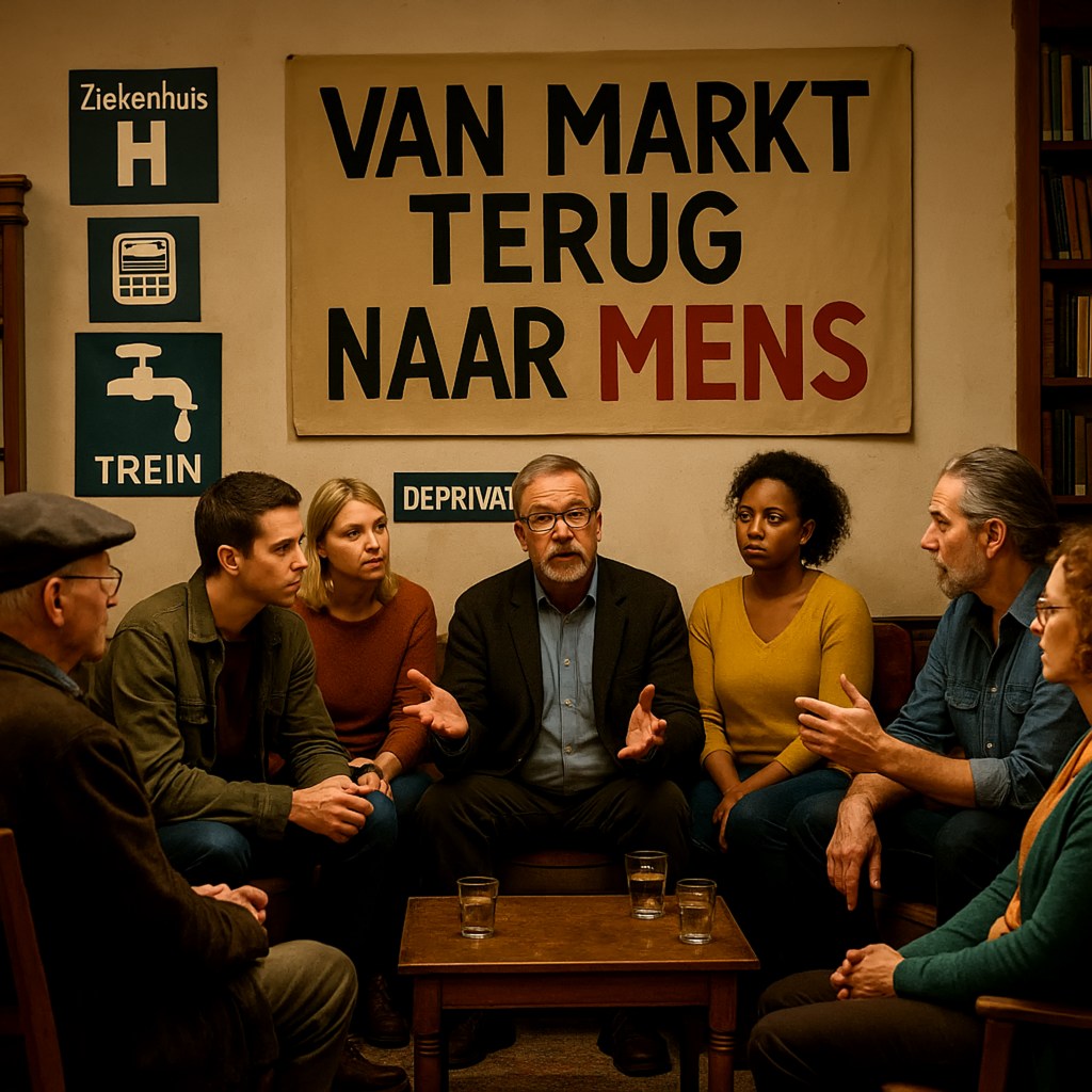 De stoelen stonden in een halve cirkel, zoals altijd. Maar deze keer hing er iets in de lucht. Geen koekjes op tafel, geen gegrinnik in de hoek. Alleen stilte, geladen met verwachting. Trees, de onverzettelijke spil van De Lege Knip, stond op. In haar hand een vergeeld krantenknipsel — een echo uit Trouw, waarin marktwerking nog werd bezongen als de redding van de publieke zaak. Maar die lofzang klonk nu vals. De belofte was gebroken.