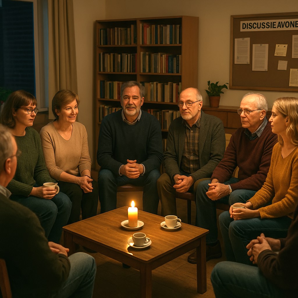 De stoelen stonden in een kring. De vrijwilligers hadden vlaggetjes opgehangen, alsof de avond al feestelijk mocht beginnen, maar het onderwerp was allesbehalve licht. Op de lange tafel stonden thermoskannen koffie, een schaal koekjes en een paar glazen water.