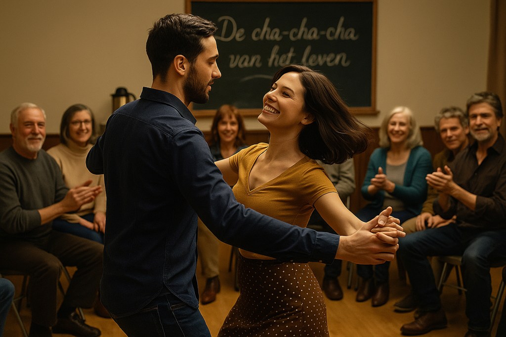En zo ontspint zich het verhaal van Alex en Robin, die allebei wat onwennig de dansvloer op stapten. Alex, nerveus maar met droge humor, en Robin, de grappenmaker die improviseerde alsof dat de bedoeling was. De dansleraar klapte in zijn handen, riep vrolijk “Stap – stap – en… cha-cha-cha!” en voor ze het wisten stonden ze midden in een ritme dat ze niet kenden.