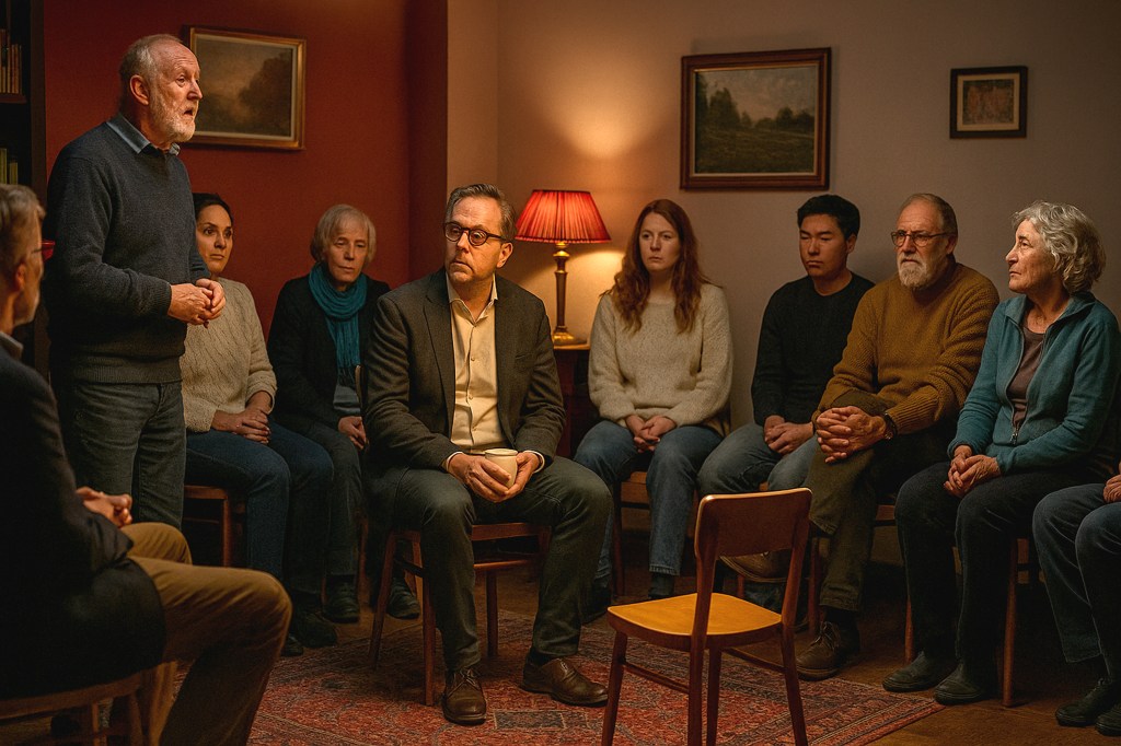 Toen hij klaar was, bleef het stil. Maar het was geen gewone stilte. Want vanavond zat de man uit het verhaal zelf bij hen in de kring. Niet op televisie, niet op een terras, maar hier, met een kop koffie in een gewone mok. Hij had zelf gezegd dat hij wilde luisteren, maar het was duidelijk dat het ongemakkelijk voelde.