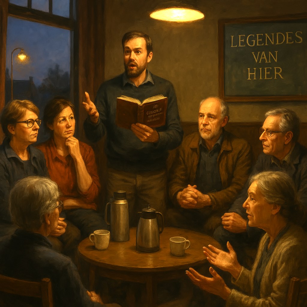 De stoelen staan zoals altijd in een kring. Buiten schuift de avond over de Kempische lucht, de straatlantaarns gaan aan. Binnen in De Lege Knip dampt de koffie uit de thermoskannen, en op het krijtbord staat in sierlijke letters: “Legendes van hier.”