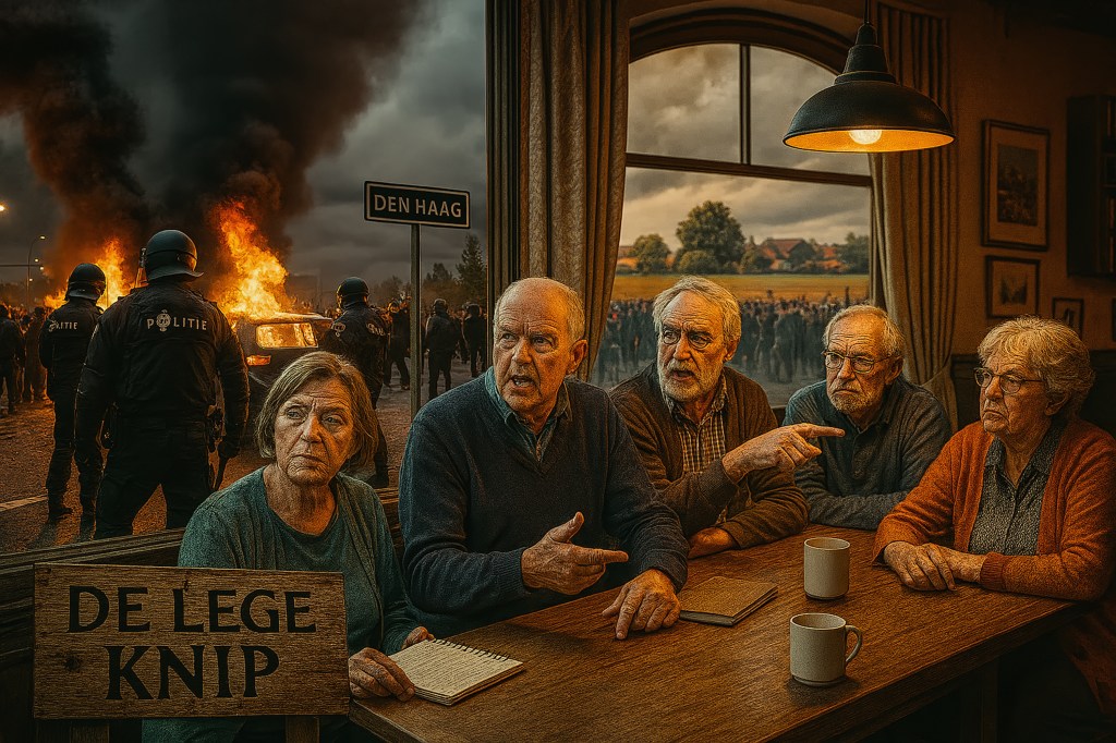 “Luister,” zegt de een met harde stem, “het is niet alleen maar retoriek. Mensen zijn het zat. Kijk naar Den Haag: daar zegt het volk wat hier óók leeft.”