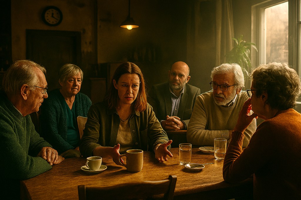 Het was een rustige namiddag in De Lege Knip. De zon viel schuin door de ramen, het gerinkel van kopjes klonk als een ritme dat het dorp kende. Aan de grote tafel zat Jannus met zijn krant, de weduwe van Van Gils met haar breiwerk, en een jonge ambtenaar van de gemeente die zich graag mengde in gesprekken die eigenlijk niet voor hem bedoeld waren en een jonge huisarts die af en toe langskwam om te luisteren. Marius zat erbij, zwaar in gedachten verzonken.
