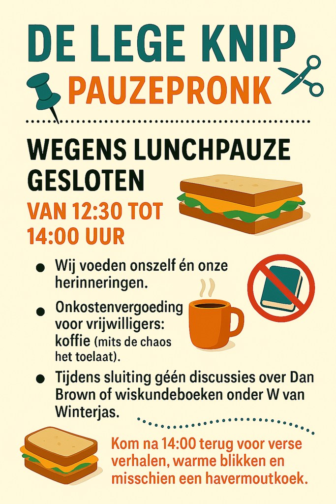 Die middag zat Trees met een thermoskan en een zelfgebakken havermoutkoek tegenover Jannus, die genoot van een broodje kaas zonder boekenbalast. “Nu nog iemand die deze pauze historisch noemt,” zei hij, “dan hangt er straks een monument naast de koffieautomaat.”