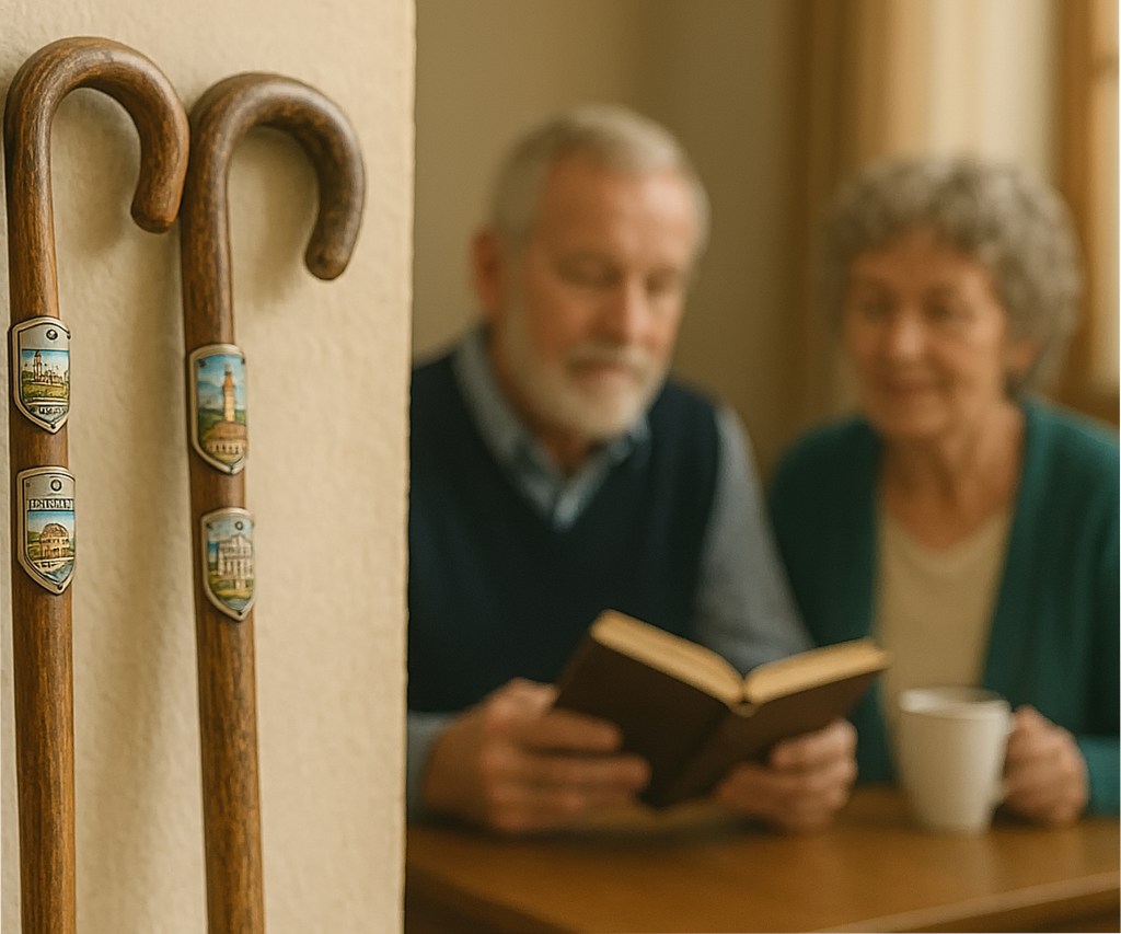 “Zeg Trees,” begon Jannus terwijl hij in zijn koffie roerde, “heb jij vanmorgen dat oudere dametje gezien in de winkel? Ze bracht een stel wandelstokken. Onder elk handvat had ze kleine metalen plaatjes gespijkerd. Souvenirs, zei ze. Van al haar reizen met haar man.”