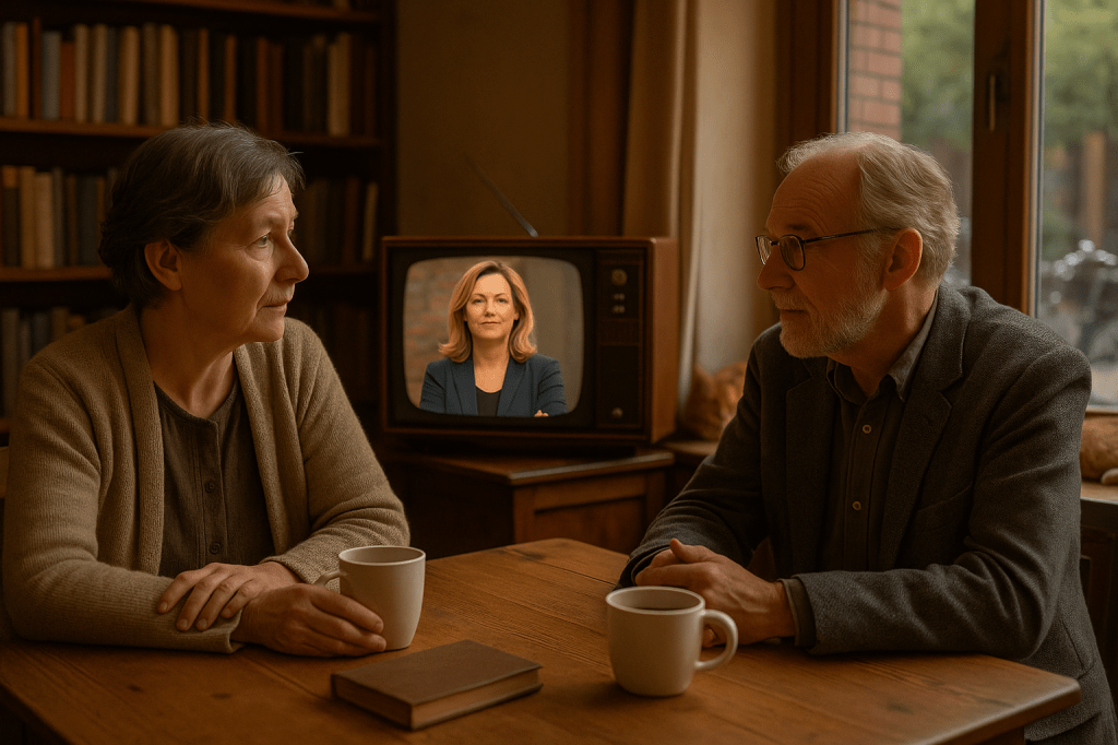 “Precies,” zei Trees, terwijl ze haar mok op tafel zette. “Ze is zo’n beetje de dominee van Hilversum. Alleen dan zonder kansel, maar mét een NRC-abonnement en een meningenfabriek die nooit stilstaat.”
