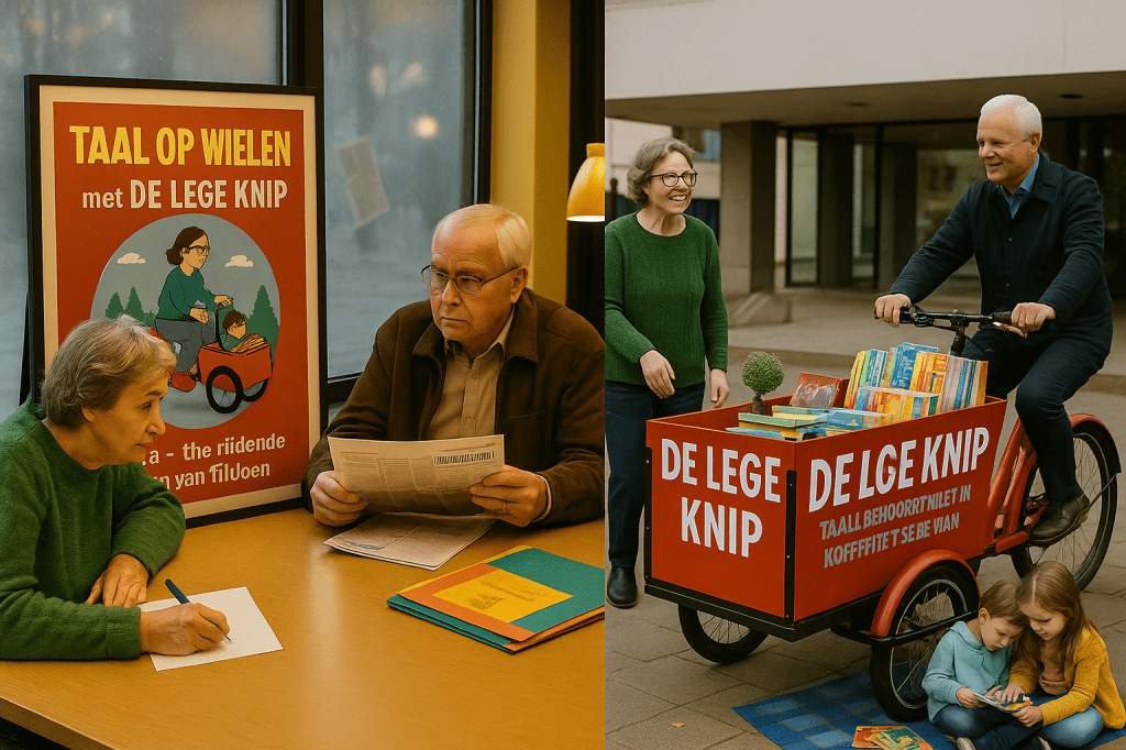 “Ja,” zei Jannus opgewonden, “een bakfiets! Maar niet gevuld met jam of flyers — met taal. Woorden, spelletjes, boekjes, een kleed. Wilma Holverda, die al meer dan vijftig jaar de bibliotheek ademt, fietst ermee door de stad. Ze stopt bij pleinen, parken, speeltuinen. En daar laat ze kinderen spelenderwijs met taal spelen.”