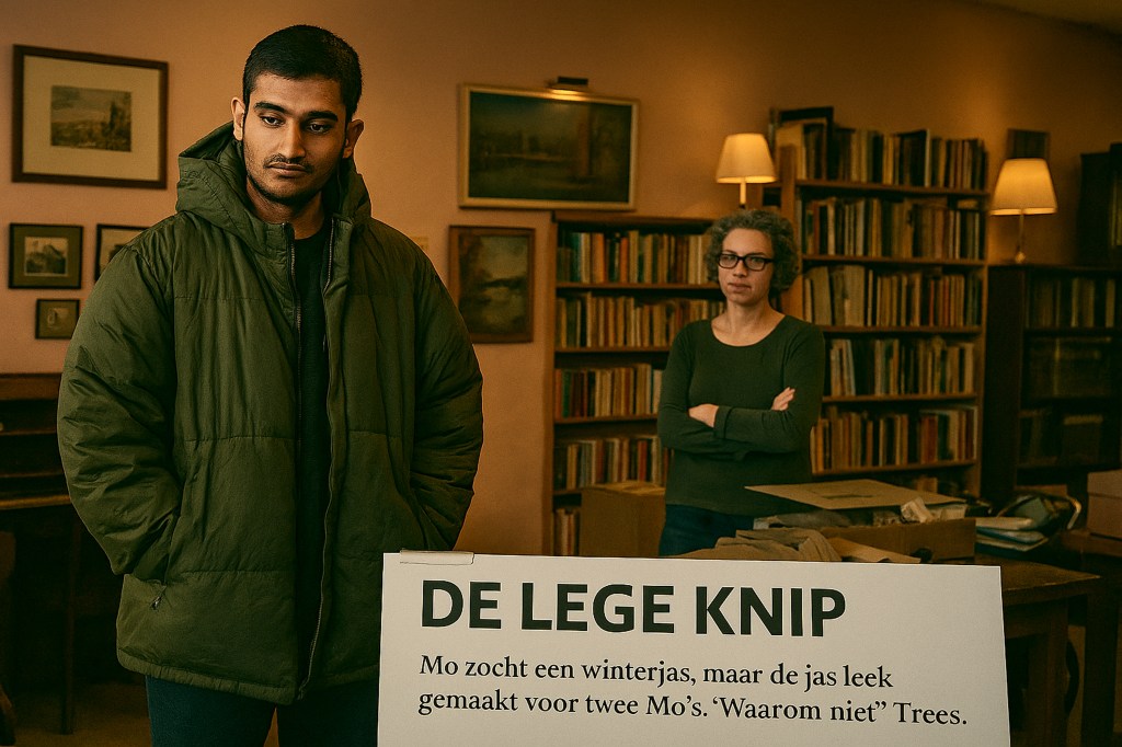Mo paste hem. De jas viel ruim, alsof hij gemaakt was voor twee Mo’s. Hij keek in de spiegel, niet om zichzelf te bewonderen, maar om te zien of hij erin mocht bestaan.