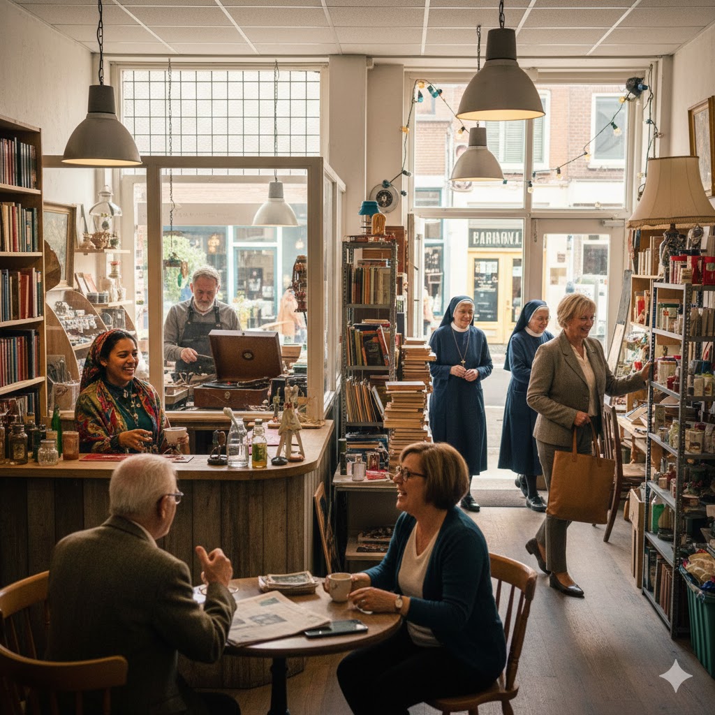 In de stilte van de bibliotheek, een oase van rust te midden van de bedrijvigheid, waren Zuster Justina en Zuster Josephine ijverig in de weer. Met hun kenmerkende kalmte sorteerden ze pas binnengekomen boeken. Ze wisselden af en toe een gedempte zin uit over de theologische implicaties van een kerstboodschap, terwijl ze met hun vingertoppen liefdevol over de kaften van oude romans streelden. Voor hen was dit werk een contemplatieve bezigheid, een manier om de geest te voeden en orde te scheppen in de overvloed.