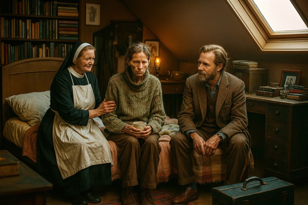 Sally zat rechtop in bed, de nieuwe wollen trui tot aan haar kin opgetrokken. Haar blik schoot onrustig heen en weer. “Wat willen jullie van me?” vroeg ze scherp. “Niemand doet dit zomaar. Moet ik formulieren tekenen? Gaan jullie de sociale dienst bellen zodat ze me definitief ongeschikt verklaren als moeder?”