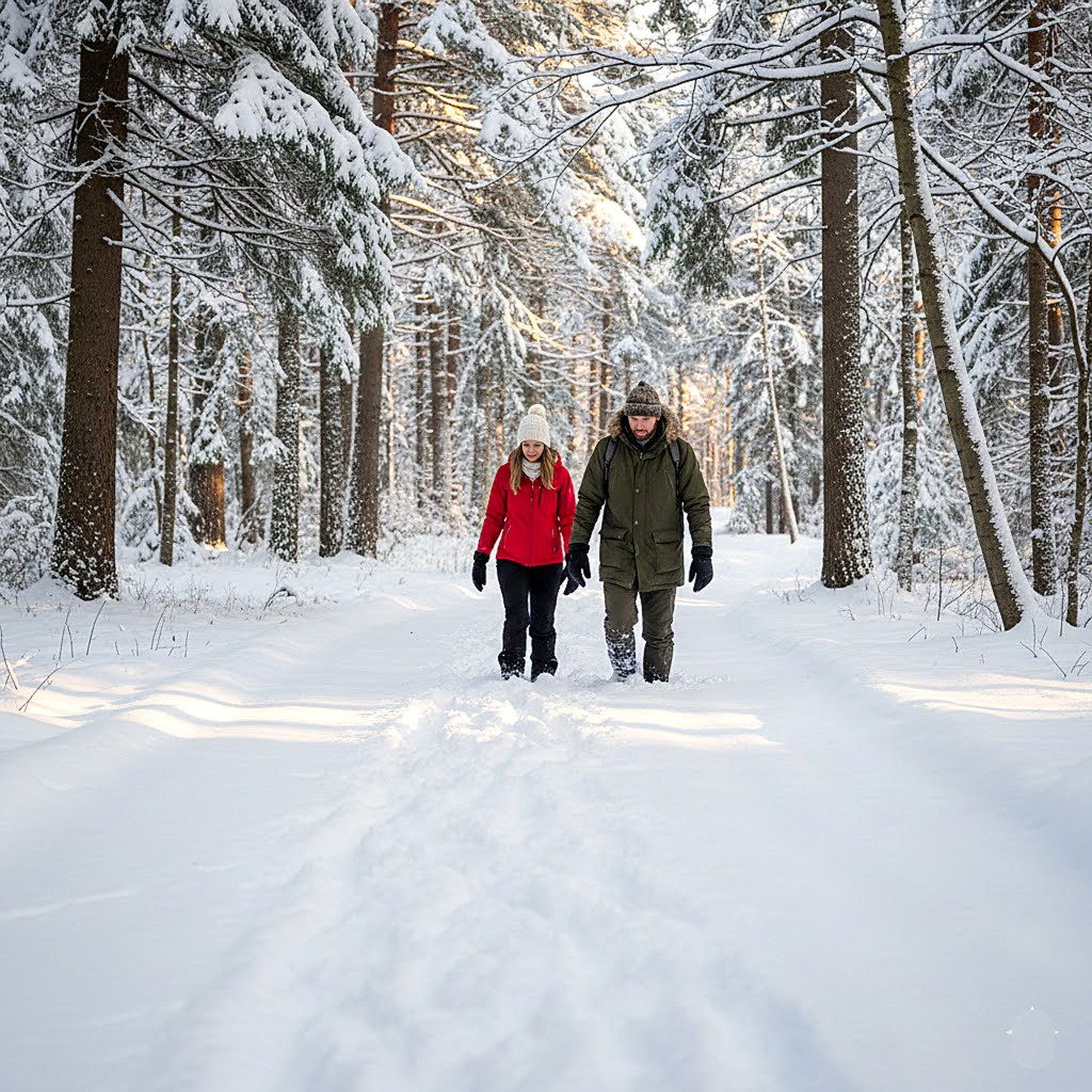 De tijd is ongemerkt voorbijgevlogen terwijl ze tussen de zwaarbesneeuwde dennenbomen door liepen. De gesprekken en de indrukwekkende stilte van het bos zorgden ervoor dat Jannus en Sally de klok volledig vergaten. Pas wanneer de blauwe gloed van de schemering over de witte paden valt en de contouren van de bomen vervagen tot zwarte schimmen, realiseert Jannus zich dat ze moeten omkeren.