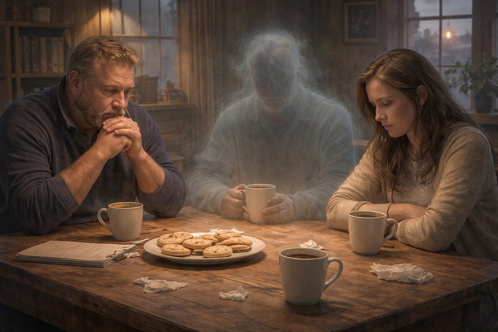 En ergens, tussen de stilte en de woorden die nog moesten komen, leek het alsof de onzichtbare gast even meeluisterde. Niet verdwenen.